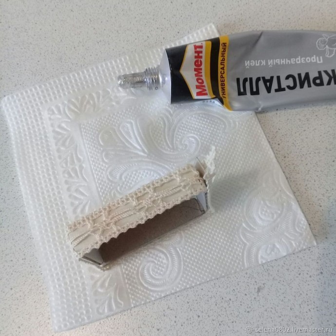 4. На листе картона размечаем стороны коробки. Вырезаем, обклеиваем стороны снаружи и дно изнутри для улучшения внешнего вида и прочности. Декорируем кружевной тесьмой нашу корзинку.