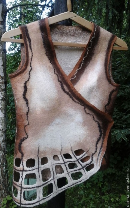 Идея родилась, как ни странно, при виде пуговичек. Они лежали уже давно и хотели куда нибудь пришиться. Для пуговичек я сваляла бело-бежево-коричневый жилет. Сетка сделана специально (сразу вспомнились жилеты Любы Ворониной), так как предполагалась «рыбная тема».