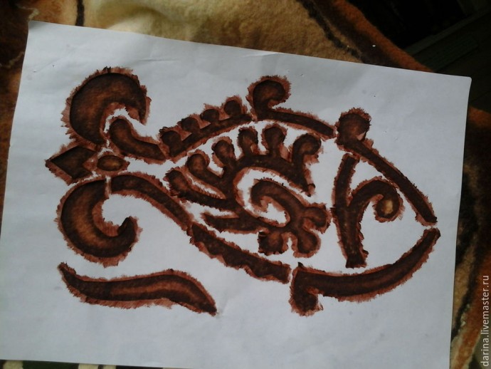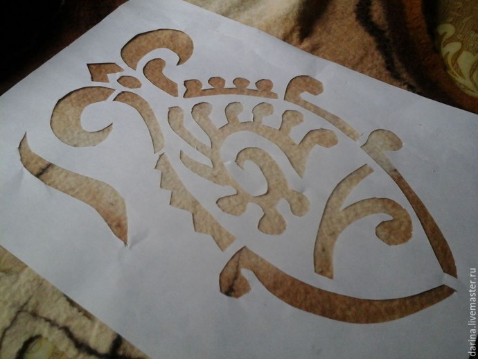 Дальше я нашла в интернете рисунок рыбки в этническом стиле (орнаменты Индии), перерисовала его на трафаретную бумагу и вырезала бритвой по контуру.