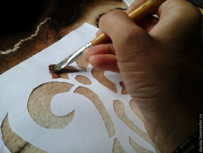 Отклеила верхний слой и приклеила трафарет на войлок. Потом стала жесткой кисточкой (можно спонжем) осторожно заполнять прорези краской, практически «вбивая» ее в войлок. На самой границе бумаги и войлока я использовала краску совсем без воды, а в центральных частях прорезей ее немного разбавляла, чтобы они получились чуть светлее.