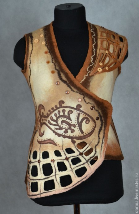 Я делаю много одежды с орнаментом, предварительно нарисовав его на шелке, а потом заваливая в войлок. Здесь я решила попробовать трафаретную роспись на готовом войлочном жилете.