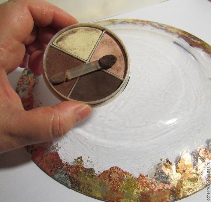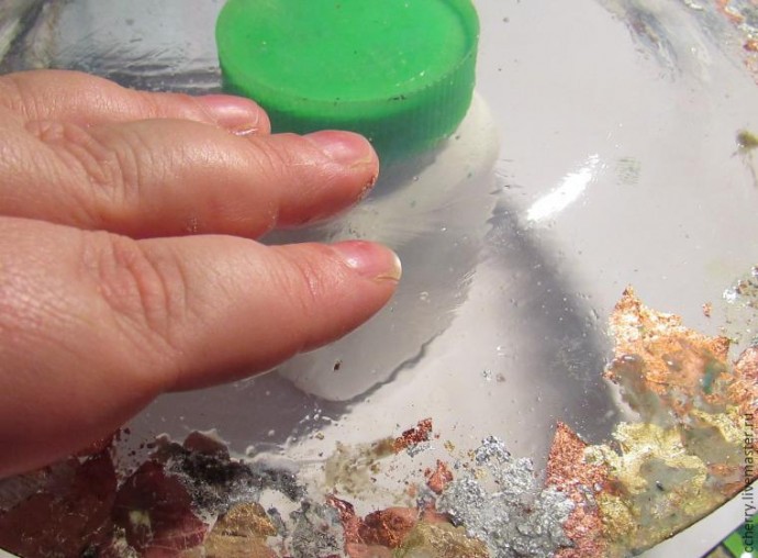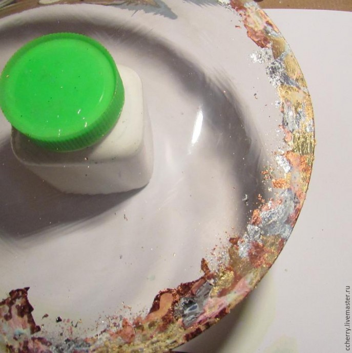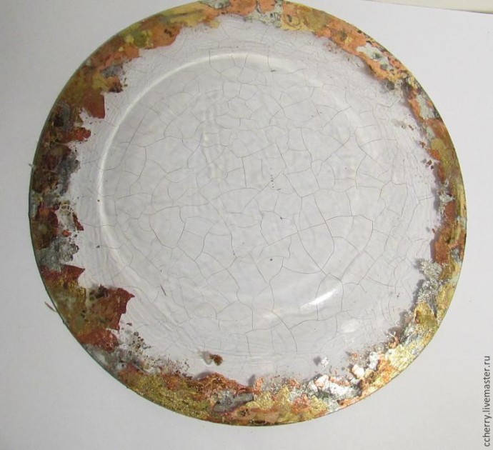 Теперь будем использовать второй шаг кракелюра. Наносим его на тарелочку, и пальцами, круговыми движениями, размазываем по всей тарелке. До тех пор пока ваш второй шаг не станет немного липковатым. Примерно это занимает около пары минут.