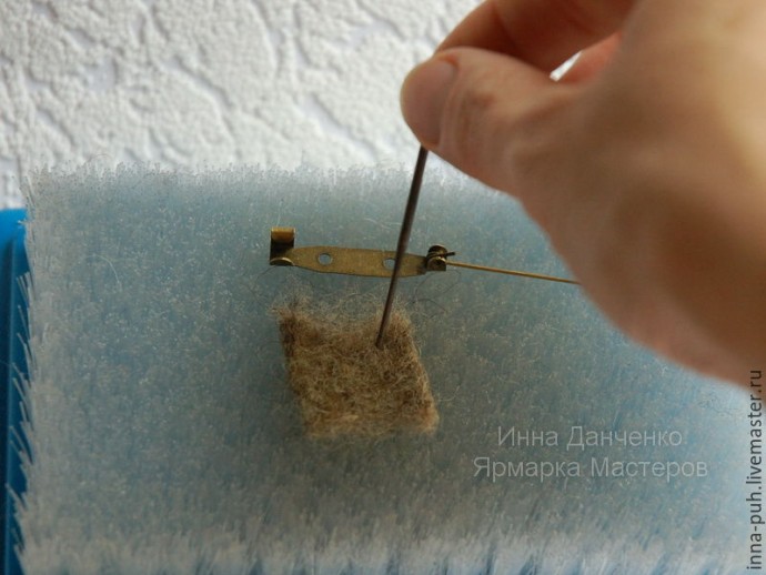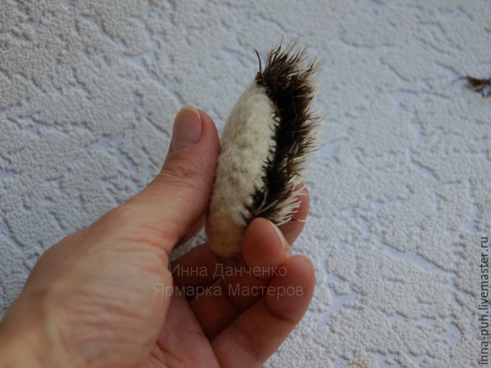 Теперь можно взять цветную шерсть темного оттенка и привалять ее к задней части брошки. Особенное внимание уделяем швам — заваливаем их шерстью, чтобы не было видно ниток