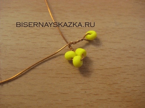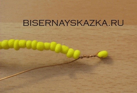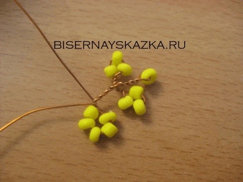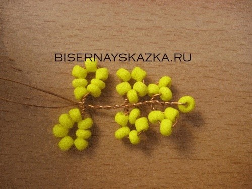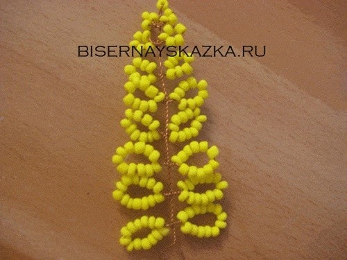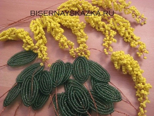Веточка мимозы из бисераЕсли готовую веточку упаковать в желтую органзу или другой полупрозрачный материал, то получится очень эффектно.