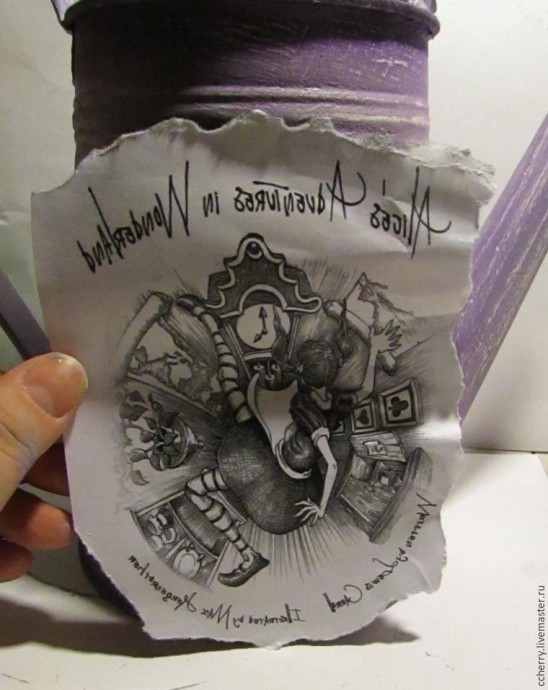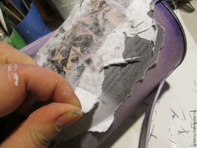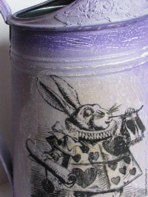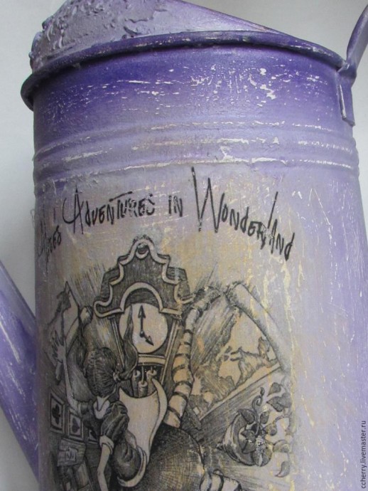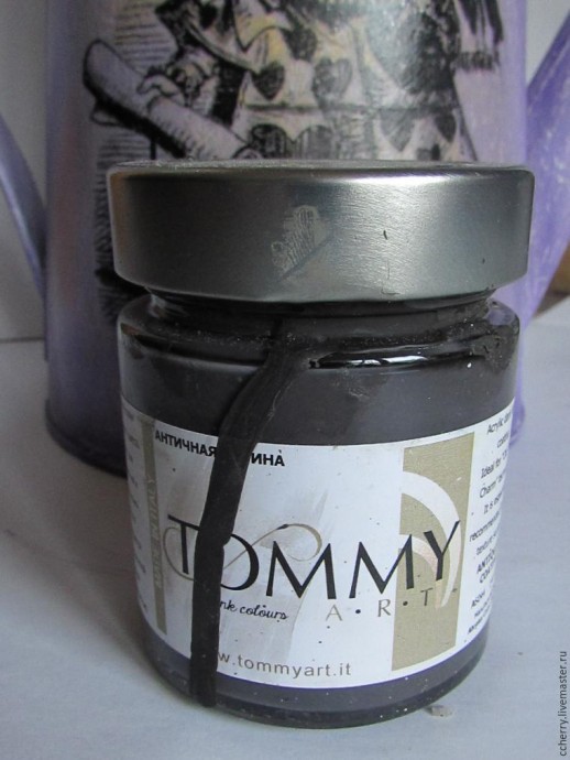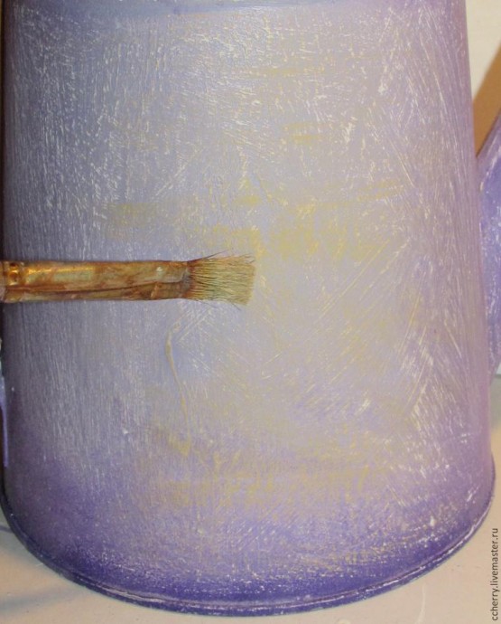 Теперь на то место, где будут картинки, сухой кистью наносим контрастную краску. После просушки на мотив и на саму леечку наносим стекловидный лак и прикладываем картикой вниз к лейке. И приглаживаем, разглаживаем, прижимаем. Высушиваем.