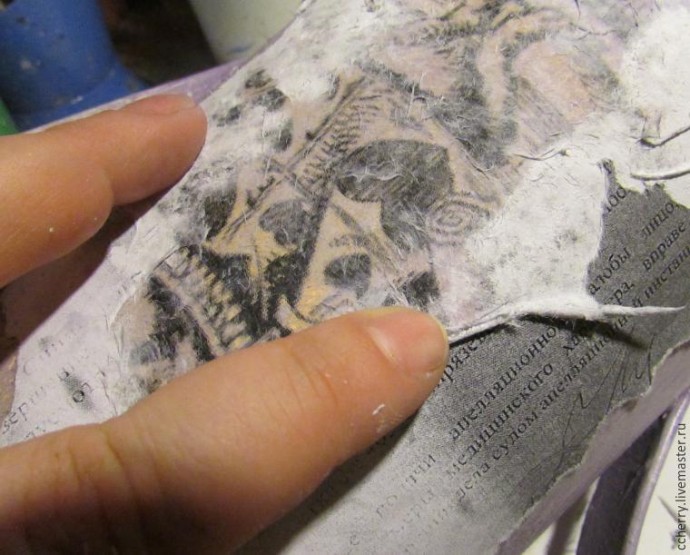 Дальше берем кусочик наждачной бумаги и шкурим. Бугорки вышкуриваем и оголяем их. Получается через наш основной цвет проглядывают белые пятнышки.