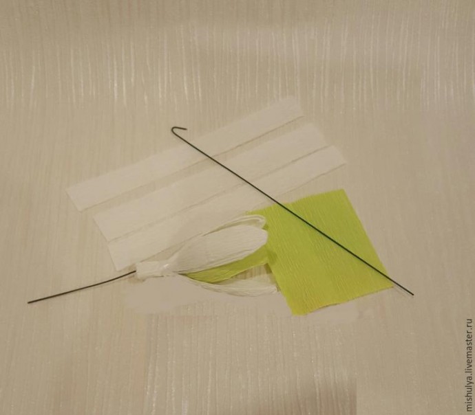 Для одного цветочка нам понадобится три полоски белой бумаги (примерно: 1 см на 3 деления) и один прямоугольник салатовой (примерно: 3 см на 1,5 деления), проволока, конфетка.