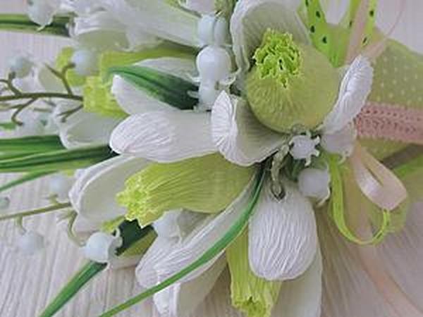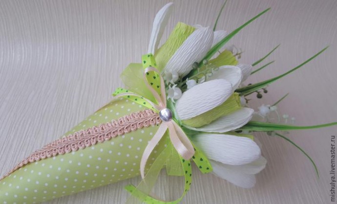 Вставляем наши подснежники в кулечек и украшаем искусственной зеленью, лентами и другими декоративными элементами