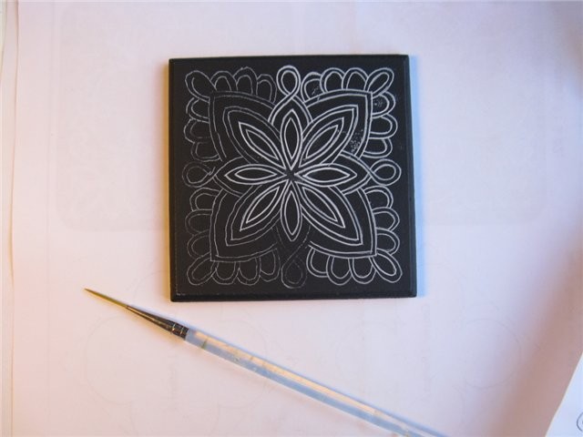 3. С помощью длинной тонкой кисти "лайнер №1" начинаем обводить белым акрилом по рисунку.