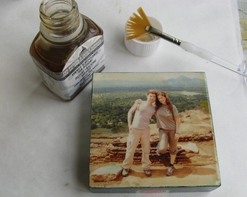 4. Приклеиваем картинки декупажным клеем, прокатывая резиновым валиком.