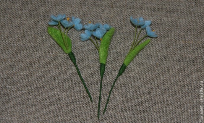 Теперь незабудки, из голубого фетра вырезаем 11 цветков, а из зелёного 3 листика.