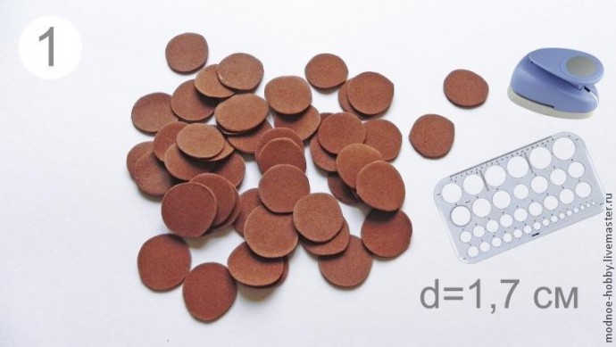 Вырезаете из фоамирана круги диаметром примерно 1,7 мм. Это наши чешуйки. Можно это сделать по шаблону, дыроколом "круг" или с помощью канцелярской линейки с кругами. Нам понадобится порядка 48-50 штук.