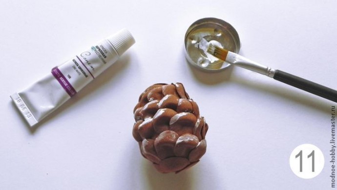 Я решила сделать не просто шишку, а заснеженную. Вы можете побрызгать ее искусственным снегом или с помощью акриловой краски сами нарисовать снег.