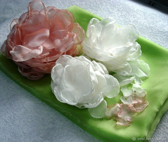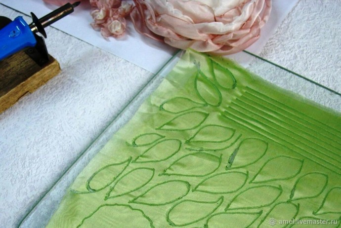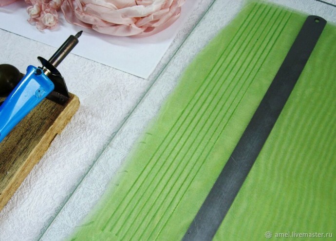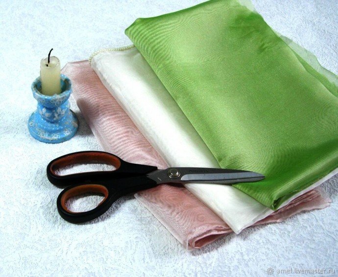 Вуаль трех цветов или более, леска, клеевой пистолет, свеча, ножницы, металлическая линейка, паяльник с тонким жалом, нож или инструмент для цветоделия, стекло.