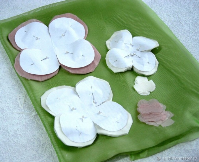 Из бумаги делаем шаблон цветка 3 размеров. Диаметром 17см,14 см,11 см. Диаметр зависит от того, какого размера вам хочется сделать цветок, и можно сделать не четыре,а пять лепестков. Можно сделать его из одного цвета, но с переходом цвета пион выглядит более естественно. Поэтому берем розовую и белую вуаль. Чтобы не вырезать по одной детали, складываем вуаль в несколько слоев, булавками крепим к вуали.