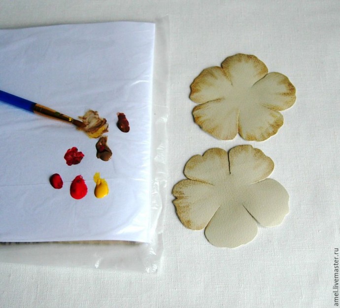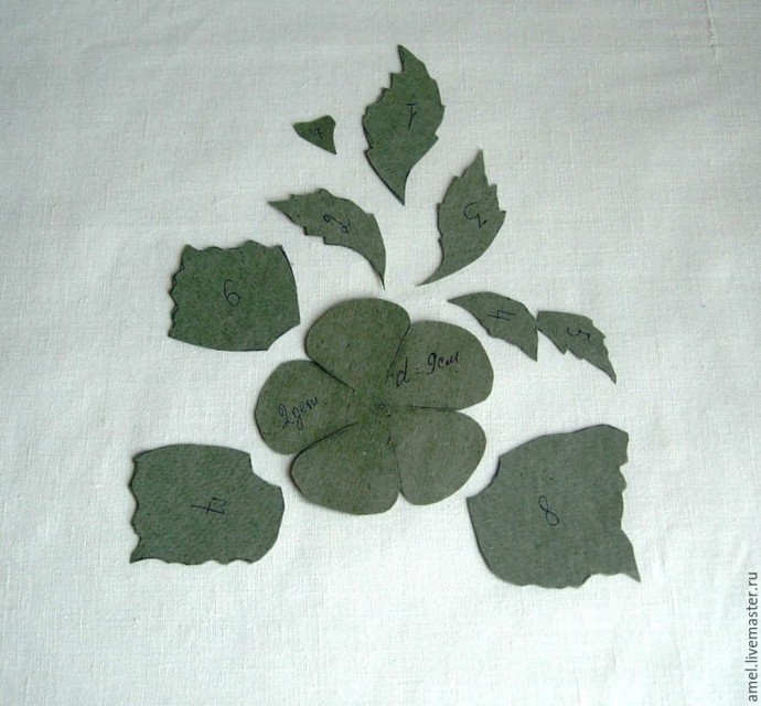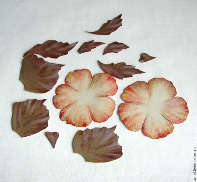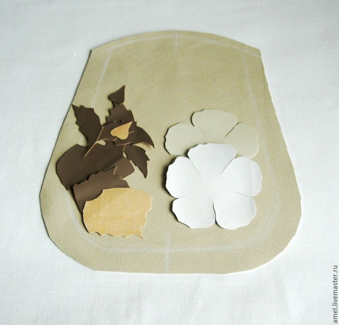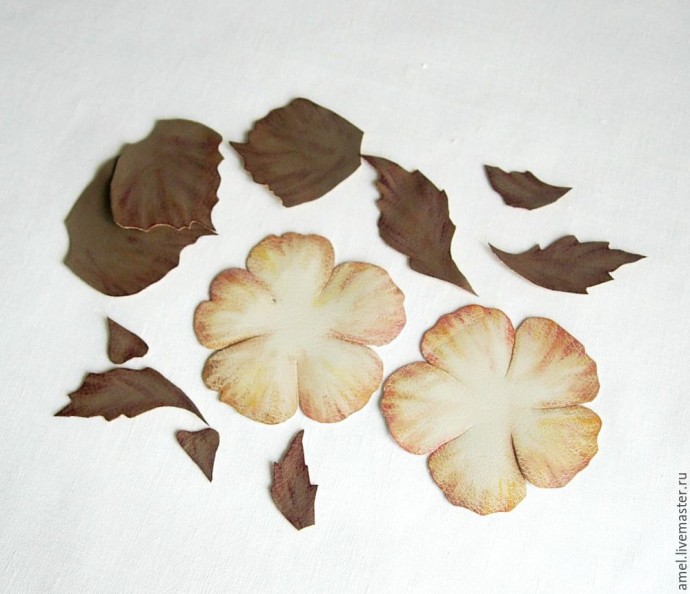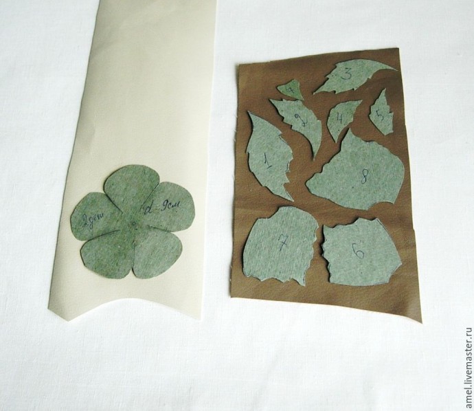 Рисую бумажный шаблон цветка и листьев. Диаметр цветка 9 см. Листья разных размеров, руководствуюсь рисунком. (Для шаблона я их скопировала с рисунка и вырезала.) Делаю раскладку и обвожу шаблоны. Цветы на молочной эко-коже. Листья- эко-кожа цвета кофе с молоком. Фото сделано так, чтобы было видно изнанку эко-кожи. Вырезаю.