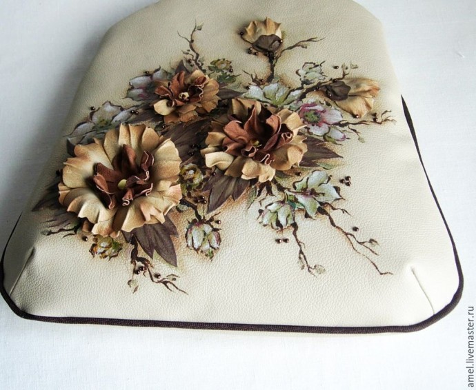 В этом мастер-классе речь пойдет о том, как декорировать переднюю панель сумочки «Осенний вальс», используя самые обычные и недорогие материалы, а именно эко-кожу. Ничего не имею против натуральной кожи, понимаю, что изделия из нее смотрятся благородно, дорого и.... И с натуральной кожей такой декор может быть смотрелся бы еще лучше, но мой пытливый ум терзала мысль, а можно ли из недорогих материалов делать что либо подобное изящным цветам, бутонам и листьям. И чтобы это было красиво, прочно и функционально (Не ищем легких путей?)