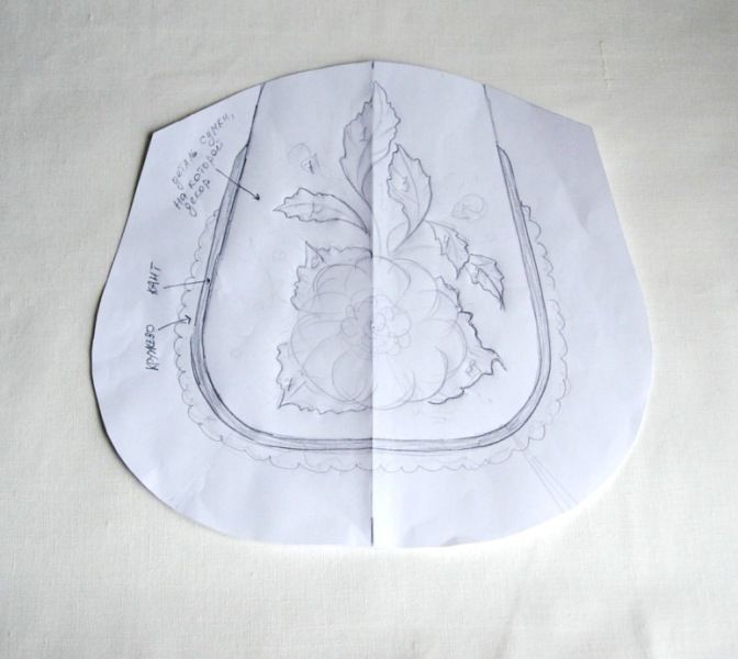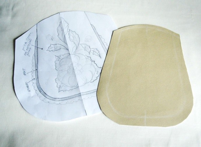 Важно: На этом этапе надо увидеть общую картину, чтобы композиция вписалась гармонично, не была слишком маленькой или слишком большой. Цветок прикидываю схематично, только для того, чтобы определить диаметр, а листья прорисовываю детально и нумерую, потому что вырезать буду по их расположению и размеру, как на рисунке... Размеры деталей сумки могут быть у всех разные. У меня размеры детали, на которой будет декор, такие: высота 25 см, ширина 20 см, вверху 15 см.