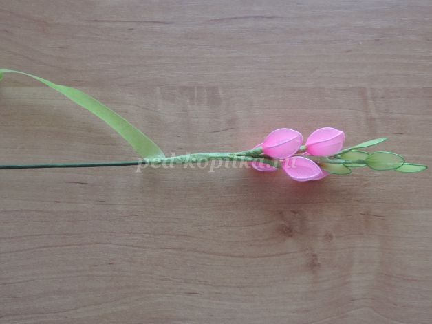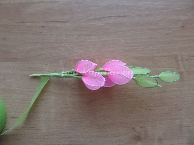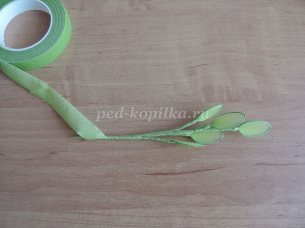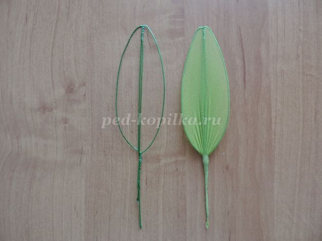 13. Придаем листьям форму и закручиваем центральные проволочки у основания. Обтягиваем капроном и обматываем лентой.