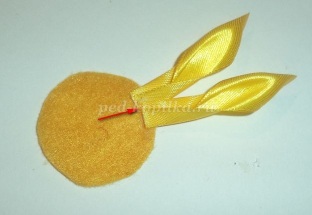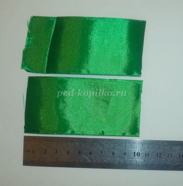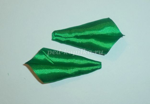 Я понимаю, что эти листочки далеки от подсолнушковых, но, что есть, то есть.Берем два отрезка атласной ленты шириной 5см длиной 10см. Можно больше.