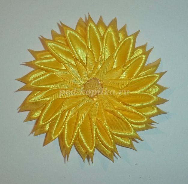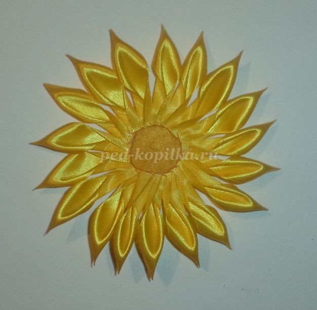 Примечание: если вы будете приклеивать лепестки рядом друг с другом, подсолнушек получится менее пышным.