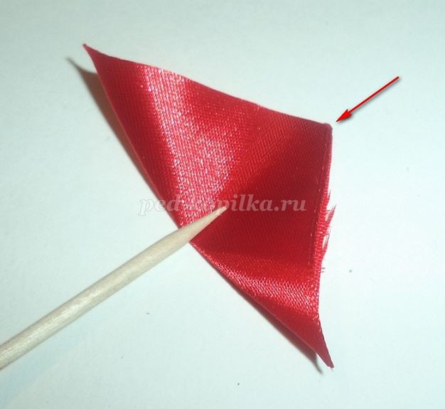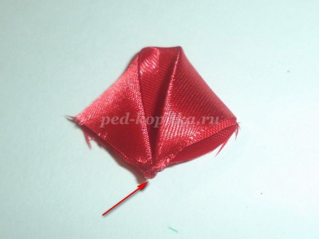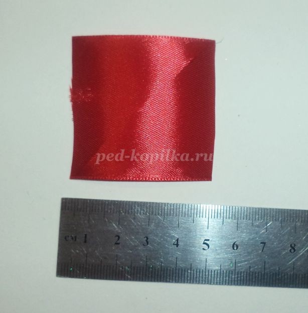 А теперь мой эксперимент: божья коровка. Конечно, можно приклеить пластиковую или деревянную, но, давайте на этот раз выдержим стиль Берем один квадратик 5х5см атласной ленты красного цвета.