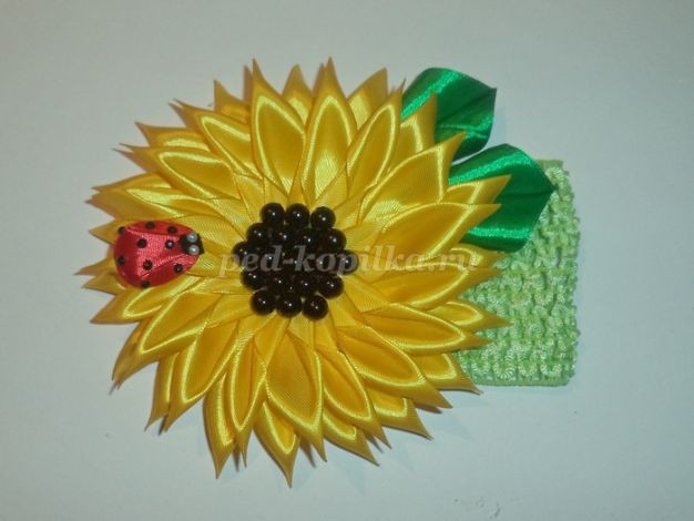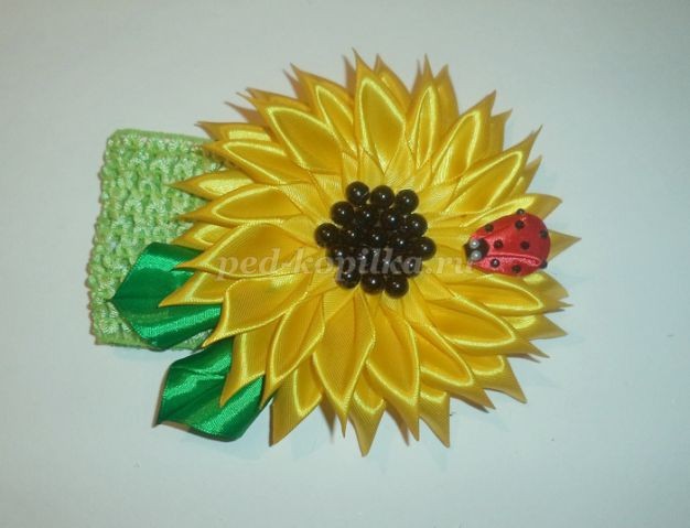 Выбираем место для листочков и божьей коровки. Подклеиваем листочки к подсолнуху, а не к повязке!Можно так.