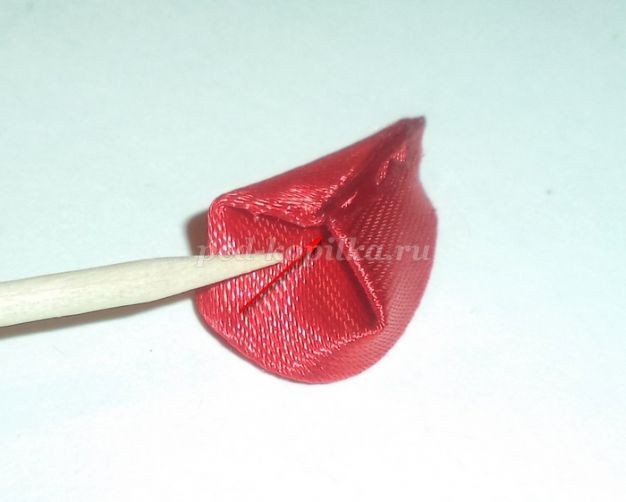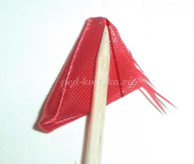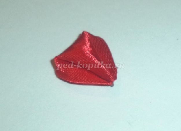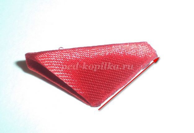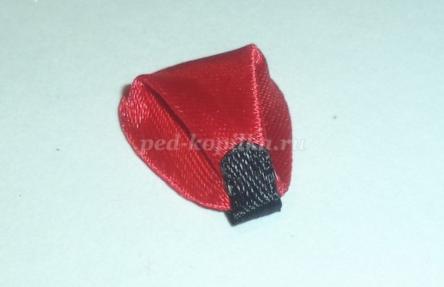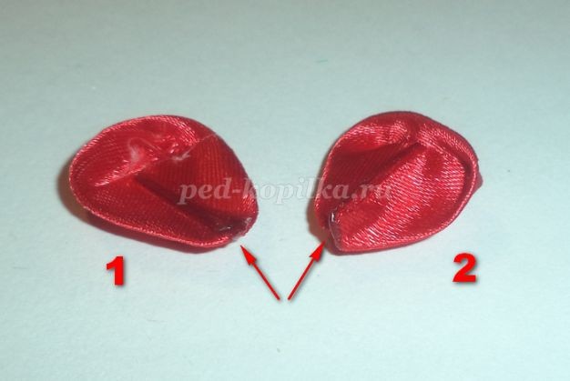 На детали №1 обрезано место спайки. Уголок обрезан, место среза обработано над огнем. Это нужно для того, чтобы легче приклеилась следующая деталь.Отрезаем от атласной ленты шириной 0,5см отрезок длиной 2-3см. Понадобиться меньше, но с меньшим отрезком не очень удобно работать. Один край немного закругляем, обрабатываем над огнем оба края.