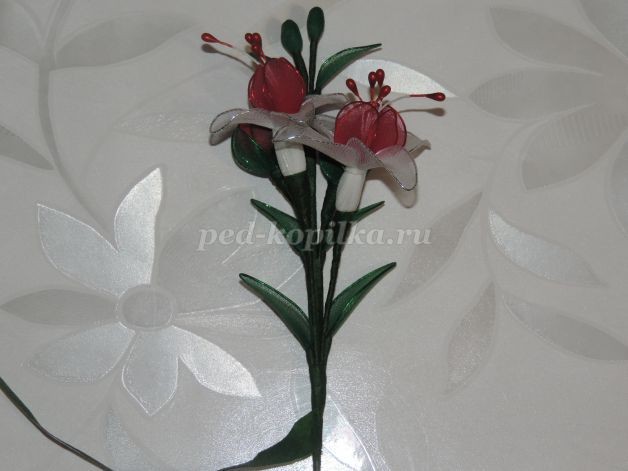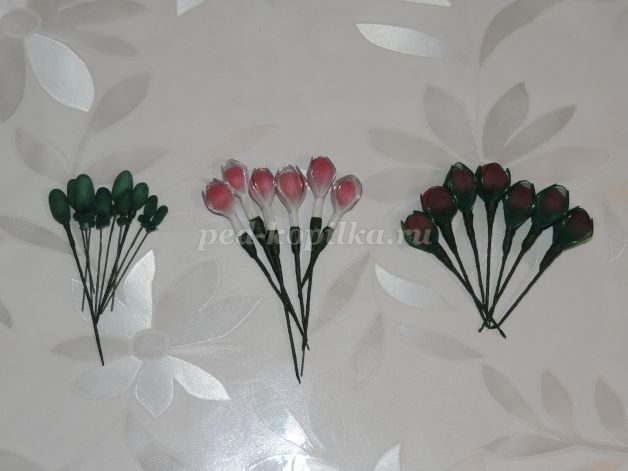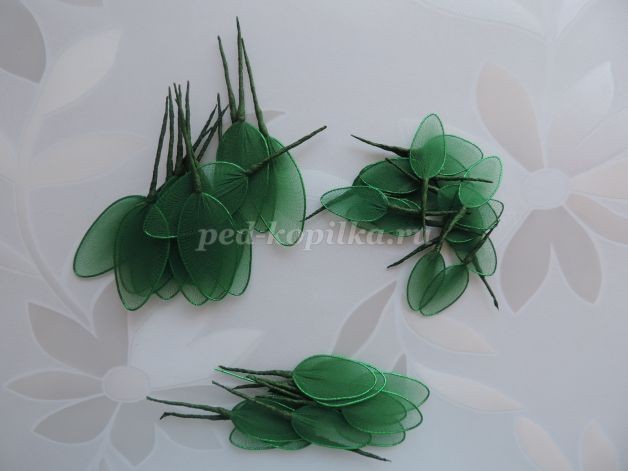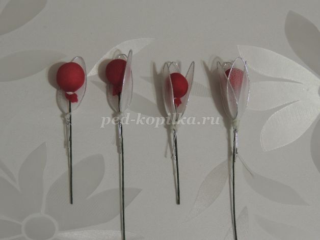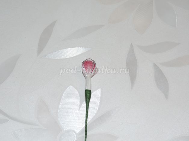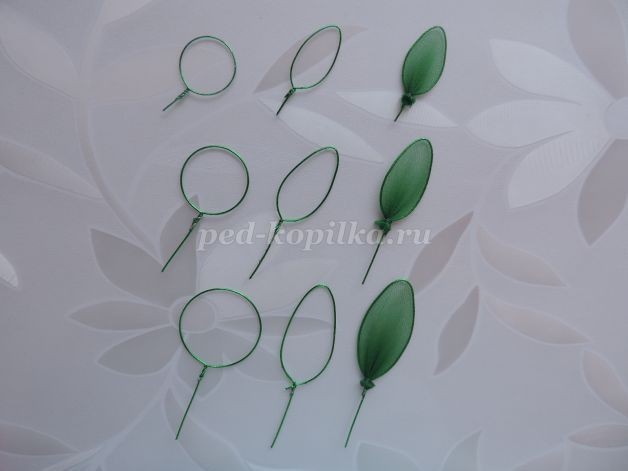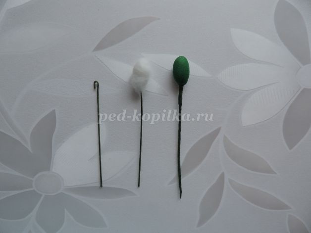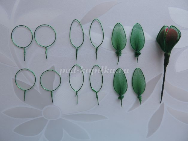 7. Из зеленой проволоки сделать 4 лепестка, придать форму, обтянуть капроном, закрепить нитками к бутону и обмотать тейп-лентой.