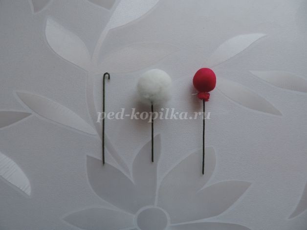 6. Собираем бутоны. На проволоку намотать синтепон и сформировать шар. Обтянуть капроном. Закрепить ниткой.