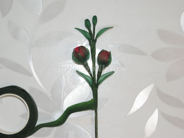 9. На флористическую проволоку 2 мм начинаем сборку веточки с бутонов при помощи тейп-ленты. Постепенно добавляем листья и цветы.