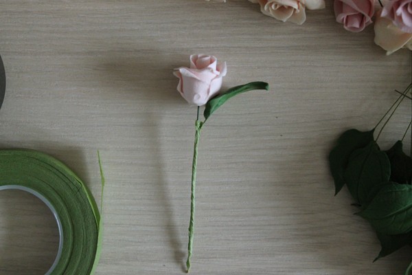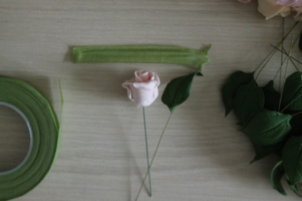 Отбираем несколько маленьких розочек (у меня получилось штук 10, остальные оставила так). Сейчас мы будем приматывать к ним листики. Для этого отрываем или отрезаем кусочек тэйп-ленты. Длина зависит от того, какой длины стебли планируется соединять. У меня она сантиметров 5-6. Берем отрезок тэйп-ленты и кончики и растягиваем в стороны: от этого он станет клейким.