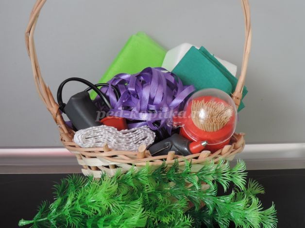 Для оформления композиции: корзинка, пенопласт, зубочистки, горячий клей, органза, креповая бумага, атласная лента, кружево, декоративная зелень.