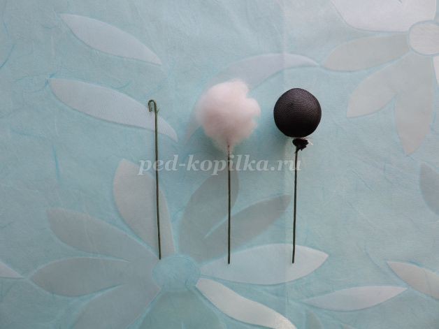 1. Начинаем работу с изготовления сердцевины цветка. Берем проволоку 1 мм. При помощи плоскогубцев загибаем край в виде крючка. Наматываем синтепон, обтягиваем черным капроном, закрепляем нитью и придаем форму шара.