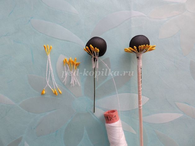 2. Тычинки разрезаем пополам и крепим при помощи нити вокруг получившегося шара. Когда тычинки закреплены, прикладываем зубочистку и фиксируем так же нитками.