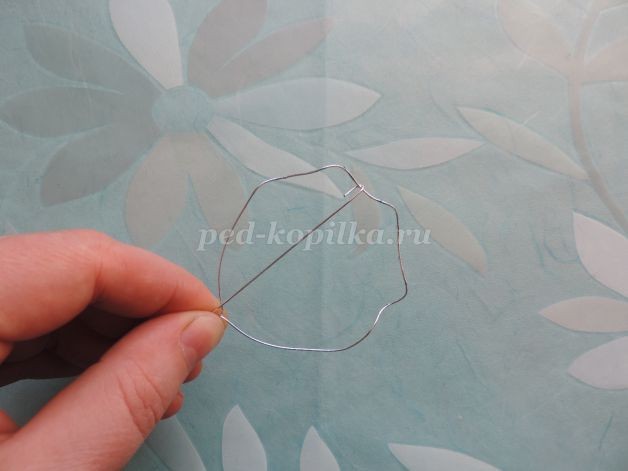 3. Отмеряем проволоку нужного размера. Кончик проволоки загибаем крючком и зажимаем плоскогубцами наискось. Закрепляем вторую, как показано на фото. У основания концы не закрепляем.