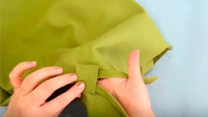 Расположить квадрат следует серединой на начало разреза с изнаночной стороны юбки при лоскутке из тонкой или сыпучей ткани. Или сдвинув на 1 см вверх от разреза при использовании для закрепки плотной ткани или основной ткани юбки