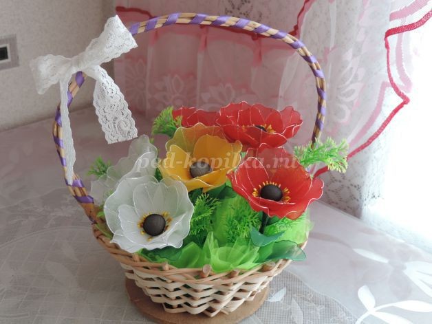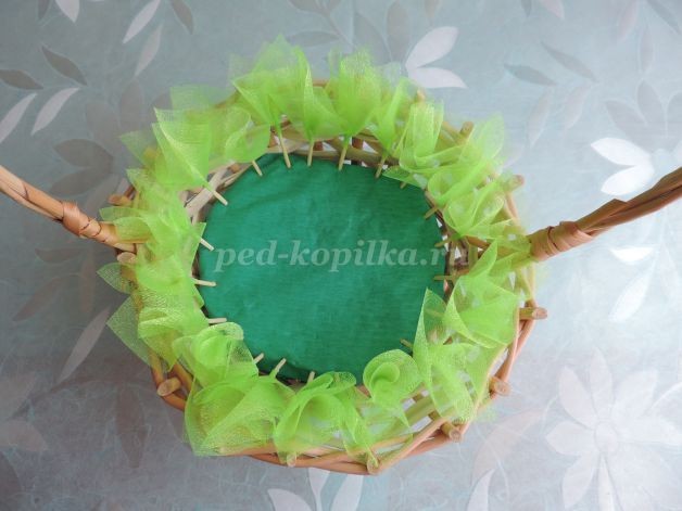 11. Ручку корзинки оплетаем атласной лентой. Из кружева завязываем бантик и закрепляем клеем. Любуемся.