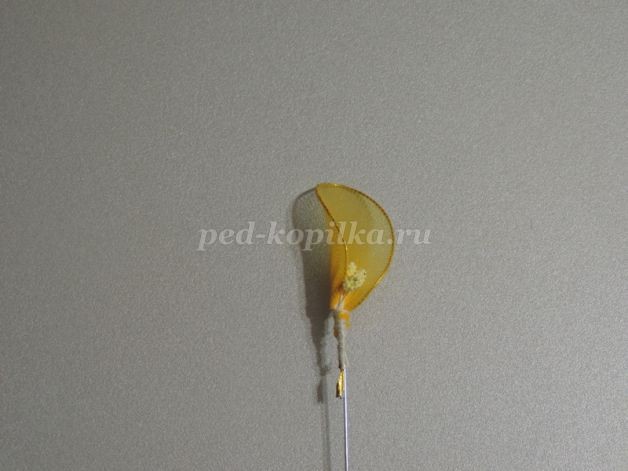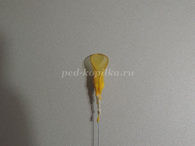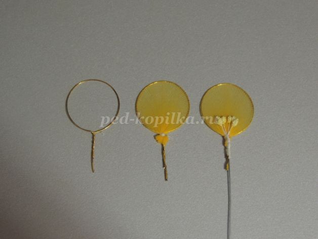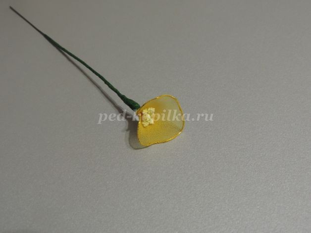 5. Из желтой проволоки сделать заготовку на шаблоне. Обтянуть желтым капроном и закрепить проволоку с тычинками.