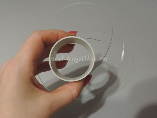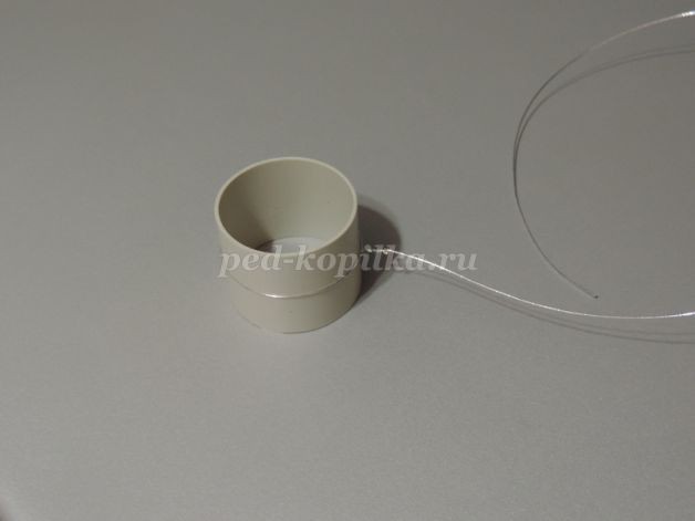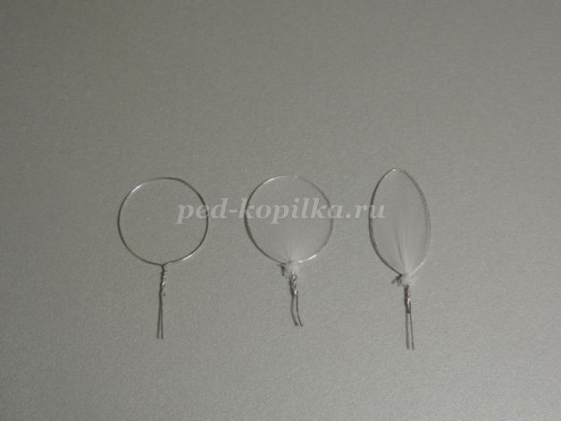 3. Заготовку круглой формы из проволоки обтянуть белым капроном. Закрепить нитками, обмотав несколько раз. Придать форму.Это наши будущие лепестки. Их понадобится 6 штук для одного цветка.На данном этапе мною была допущена ошибка. Сначала лепестку нужно придать форму и только потом обтягивать капроном.