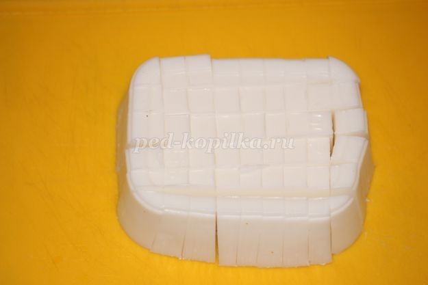2. Разрезать готовую мыльную основу на кубики. Чем мельче они будут, тем быстрее основа растопится.