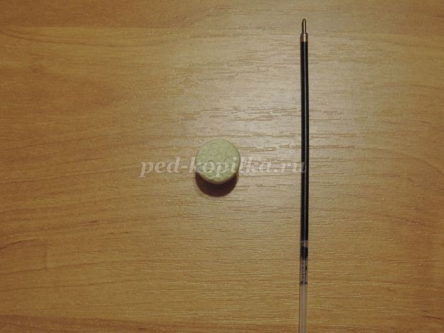 2. С помощью стержня от ручки на верхней части плода делаем круглые отпечатки. В центр вставляем проволоку 2 мм и кладем на сухую поверхность до полного высыхания.