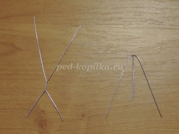 4. Приступаем к изготовлению лепестков цветка.Отмерить 2 проволочки одинакового размера и скрутить их, как показано на фото. Усики отогнуть вниз.