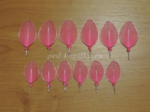 6. Придаем форму лепесткам. Обтягиваем капроном в один слой. У основания закрепляем нитью в несколько витков. Лишний капрон обрезаем. Для одного цветка понадобится 6 больших лепестков и 6 меньшего размера.