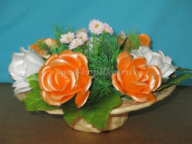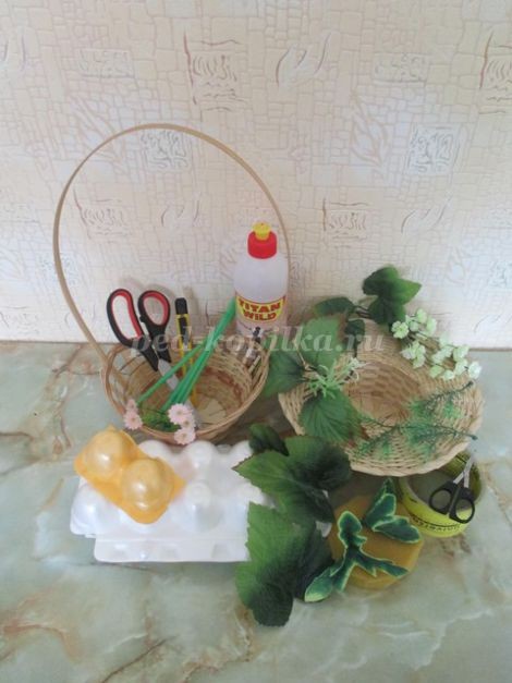 Материал: упаковки от яиц, коктейльные палочки зеленого цвета, зеленая гофрированная бумага, клей «Титан» для потолочных плиток, ножницы с острыми концами, искусственные листья, толстый поролон, корзиночка, георгиевская лента, скотч, канцелярский нож.