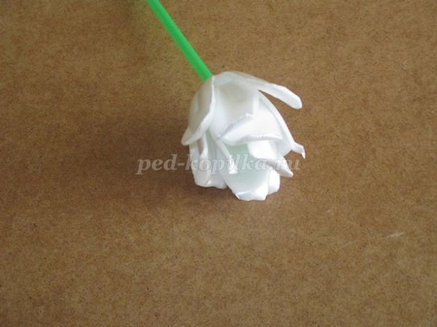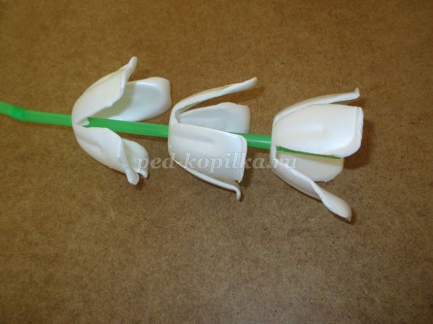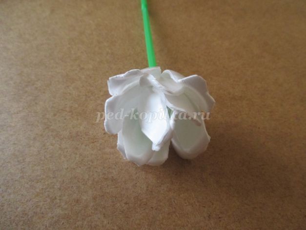 Зажимаем разрезанный конец трубочки и вставляем в проделанное отверстие чашечки. Нанизываем на коктейльную палочку 3 чашечки с лепестками, намазав низ внутренней чашечки потолочным клеем, соединяем их.