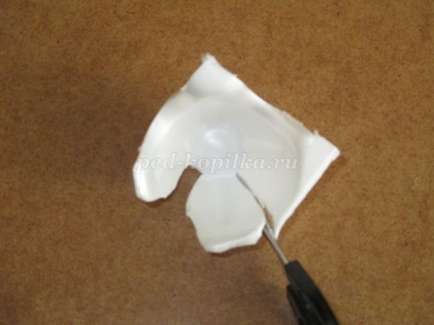 Упаковку от яиц разрезаем на отдельные ячейки. Из каждой ячейки вырезаем четыре лепестка, стараясь оставить закругленные верхние края.