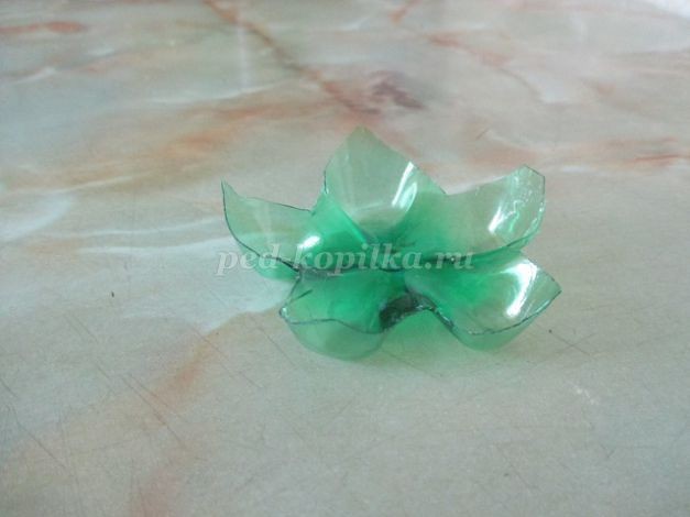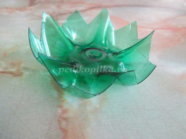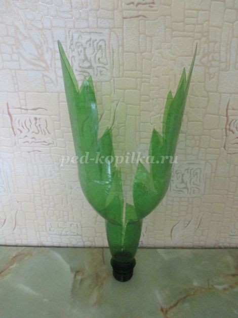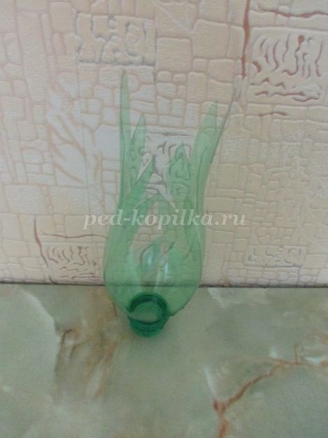 Из нижней части зеленой бутылки вырежем цветоножку, заостряя зубчики