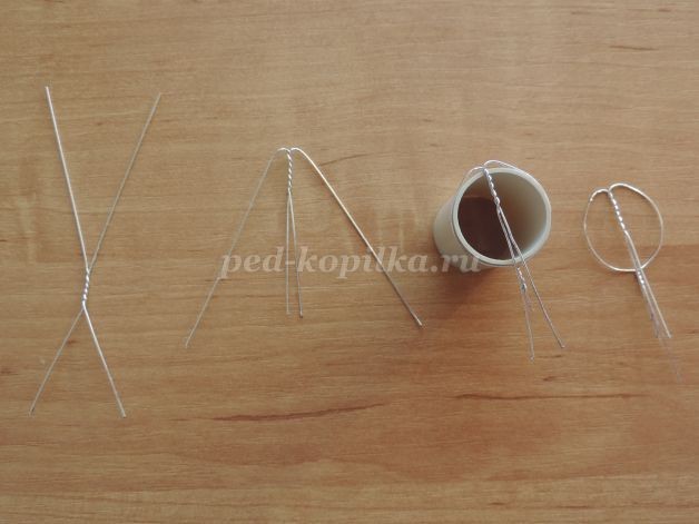 1. Изготавливаем лепестки.Скрутить две проволочки между собой чуть ниже центра. Придать круглую форму на шаблоне и закрепить у основания при помощи плоскогубцев. Оставшуюся проволоку откусить плоскогубцами, оставив небольшой «хвостик». Проволоку, которая проходит по центру, не закрепляем.