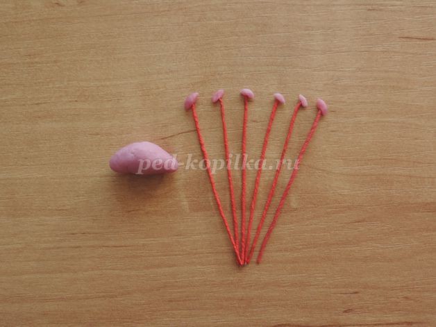 5. Из теста для лепки формируем мелкие тычинки и одеваем на проволоку. Когда тесто засохло, красим верхушки тычинок акриловой краской.